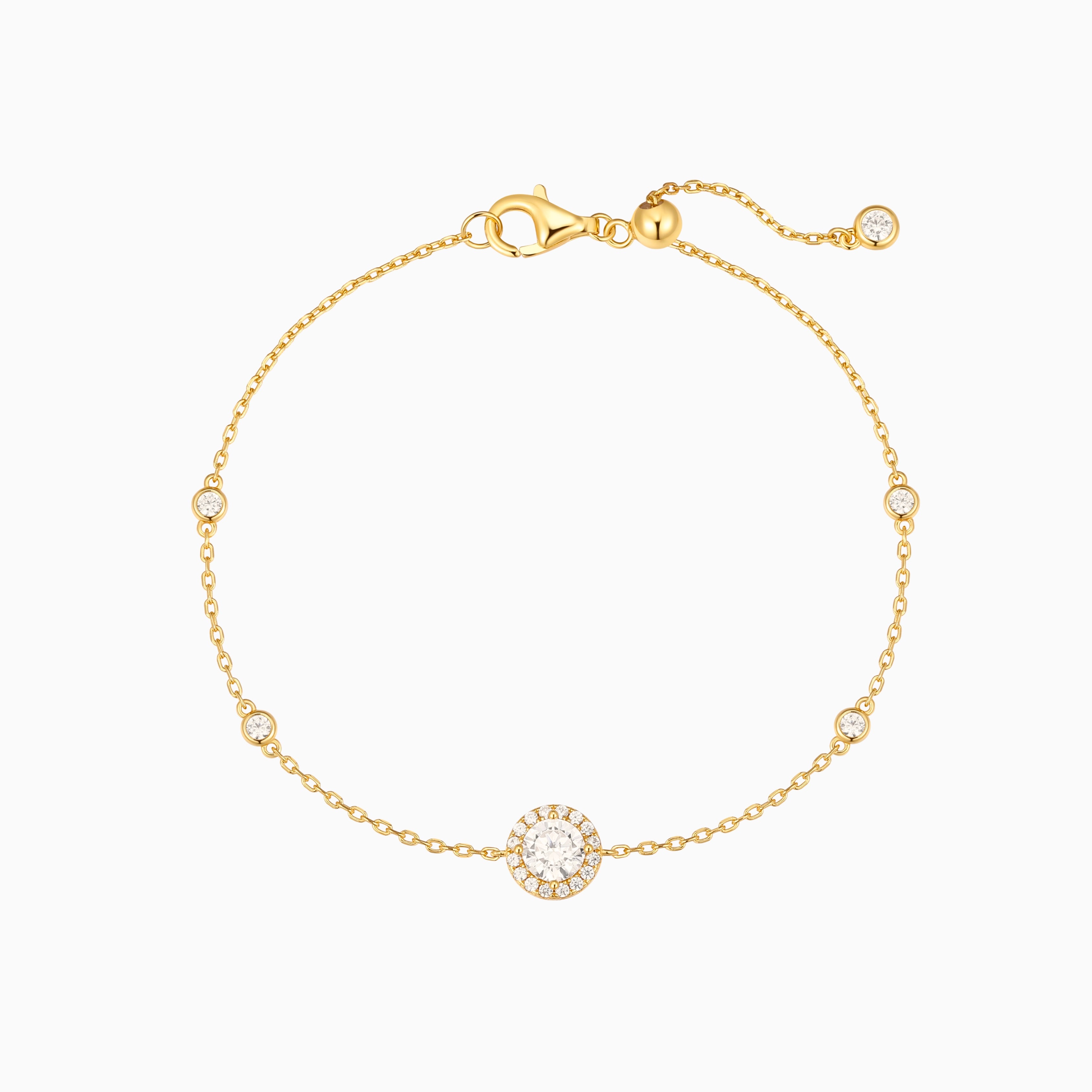 Luminous and classic, this bracelet centers around a radiant round-cut stone encircled by a delicate halo of pavé accents. The fine gold-toned chain adds a soft contrast, allowing the centerpiece to glow with captivating brilliance.