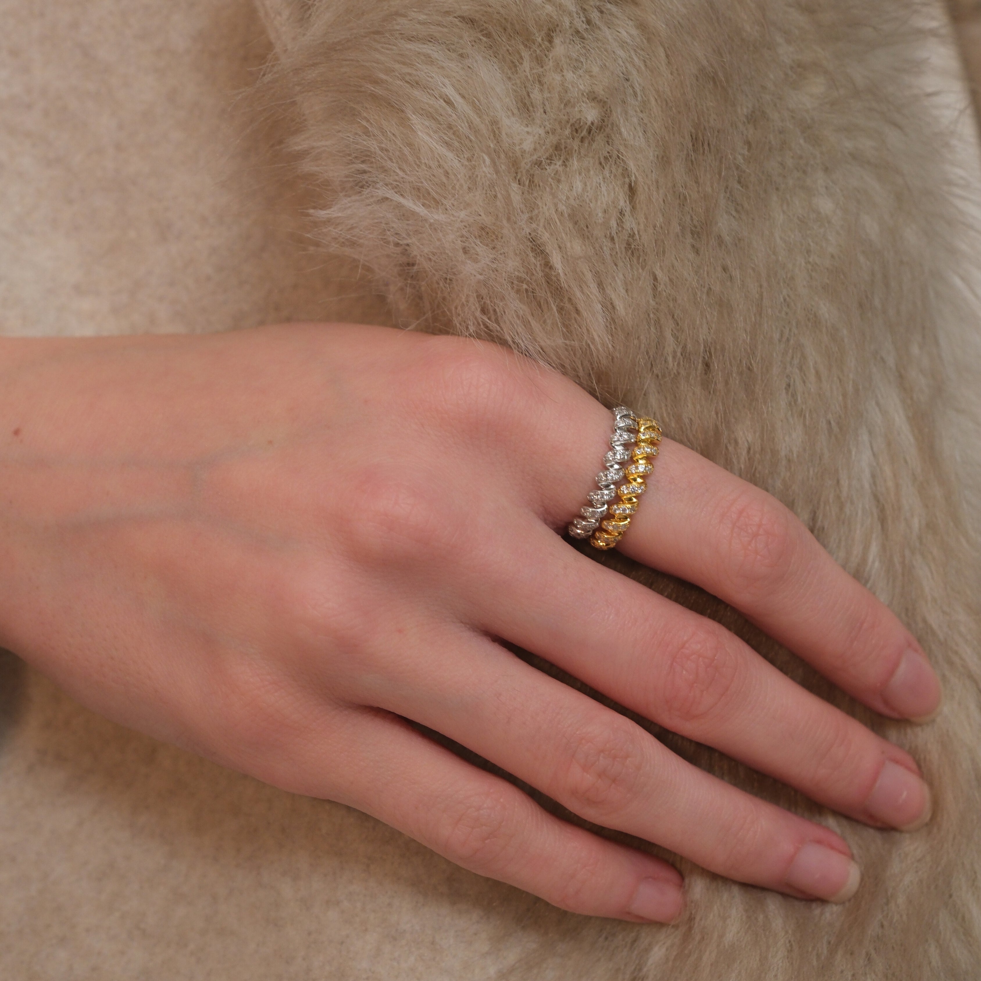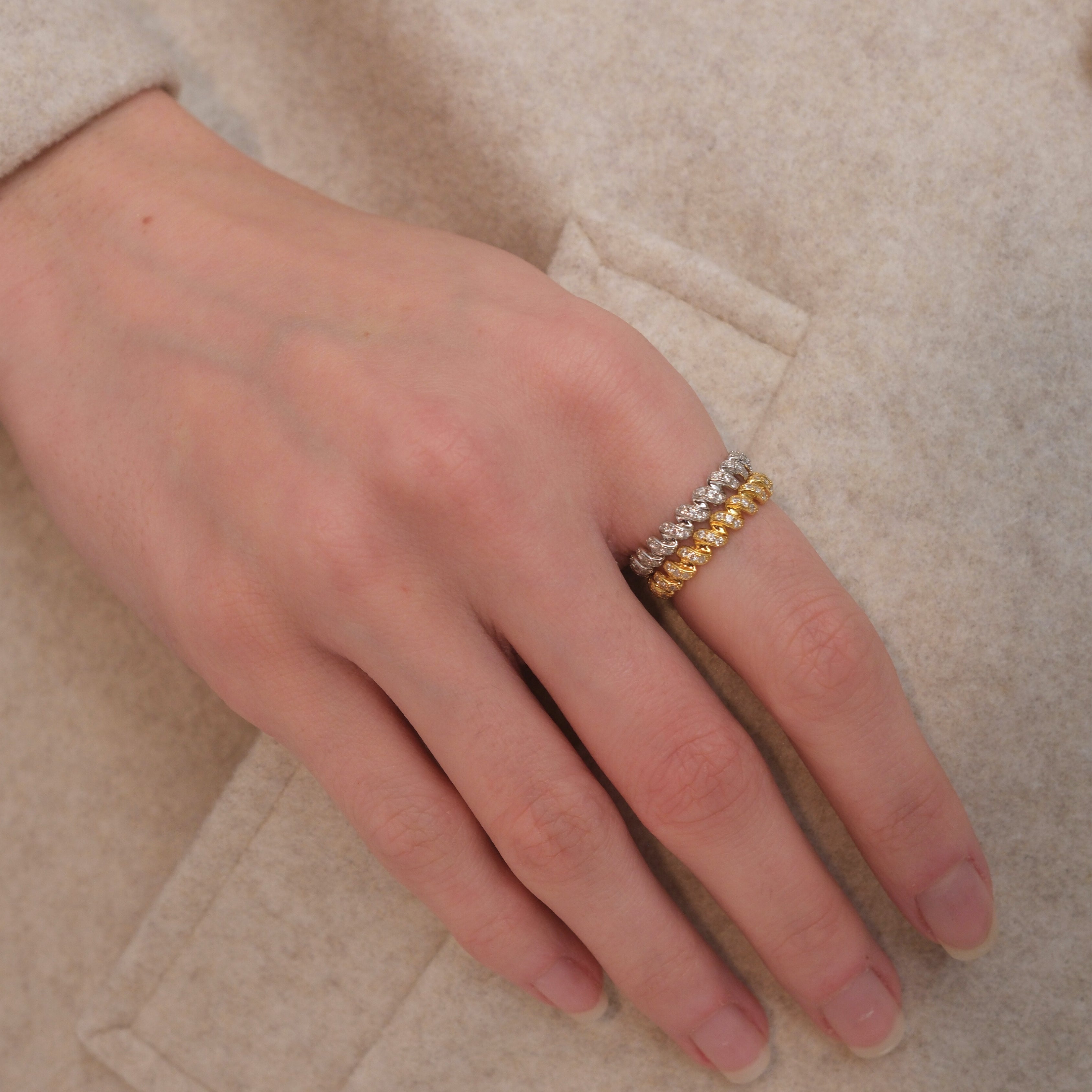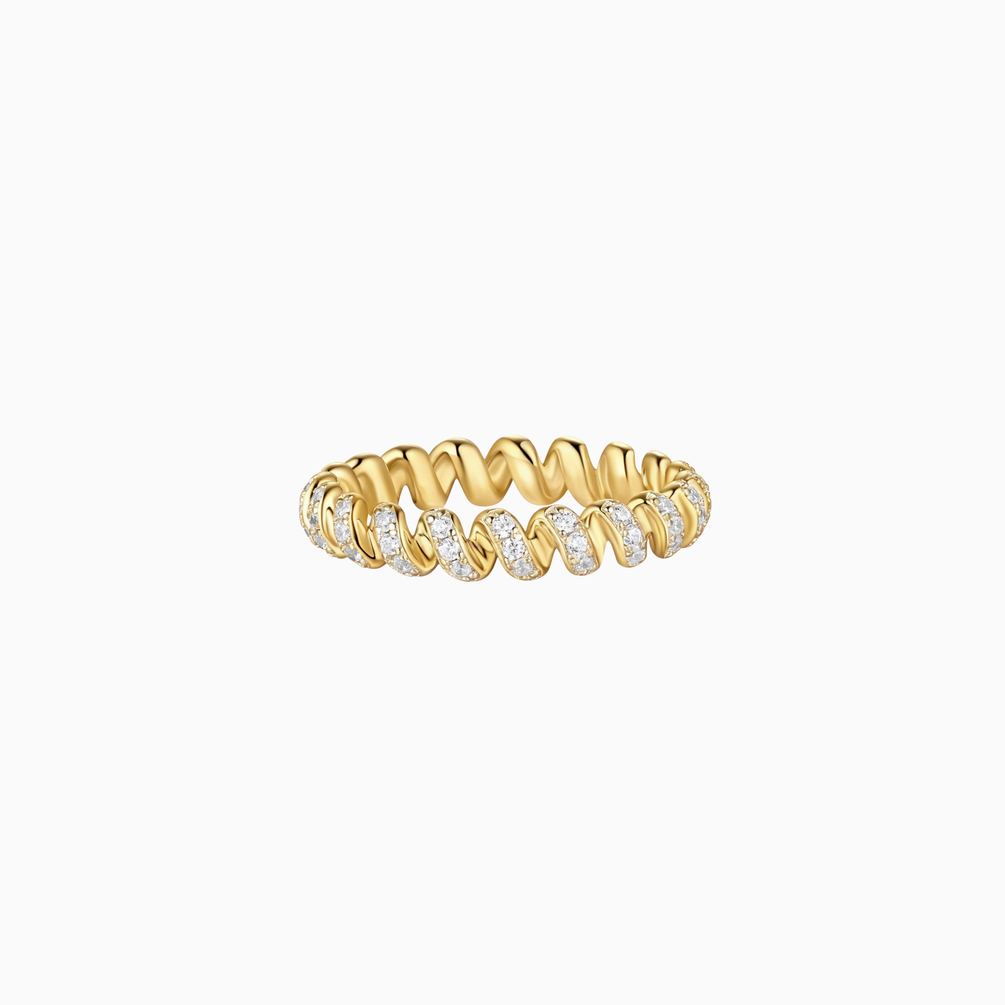 Playful and elegant, the Lyra Ring draws inspiration from gift wrapping ribbons, wrapping gracefully around the finger in a fluid spiral of light. Each curve is accented with shimmering stones that add a touch of whimsical glamour.