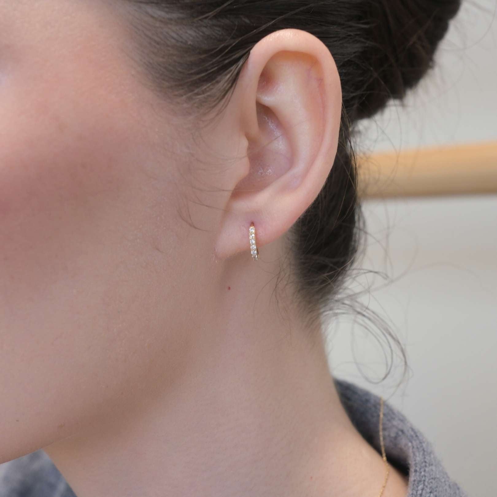 These huggies combine timeless elegance with everyday versatility, featuring a sleek band of polished gold vermeil adorned with a row of brilliant round-cut stones along the front. The pavé setting maximizes sparkle while maintaining a refined and modern silhouette, giving the hoops a luxurious yet understated appeal. Designed with a secure hinged closure, they are comfortable to wear while offering just the right amount of shine to elevate both casual and formal looks. Perfect for layering with other earrings or wearing as a standalone statement, these hoops are a staple piece that brings effortless sophistication to any jewelry collection.