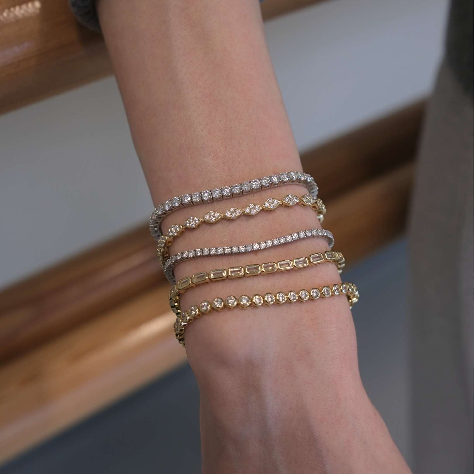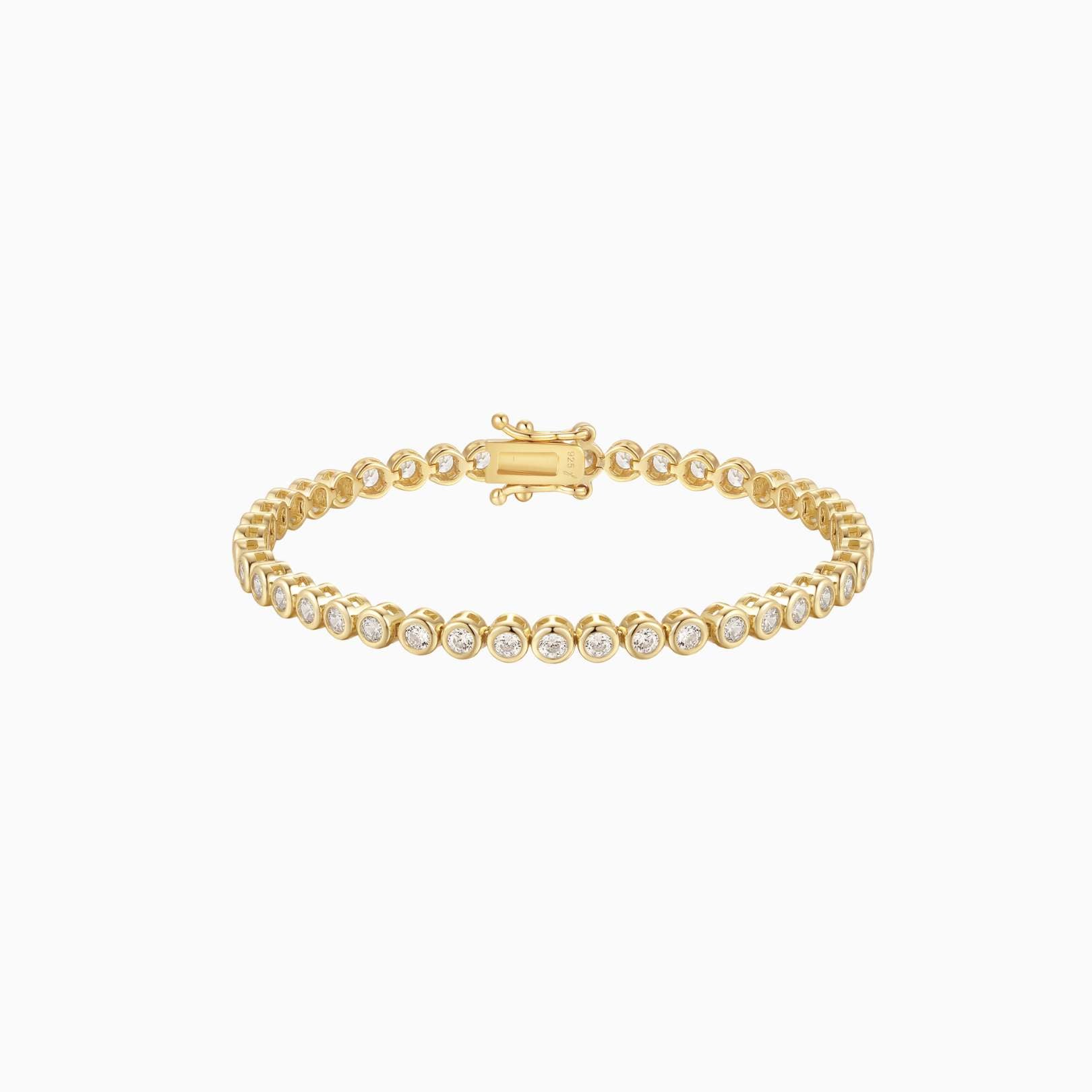 This bracelet features a striking row of round-cut stones, each framed in a smooth bezel of radiant gold that enhances their brilliance while providing a clean, modern finish. The continuous circle of perfectly set stones creates a harmonious balance of sparkle and elegance, making it a versatile piece that transitions seamlessly from day to evening wear. Its refined design emphasizes both durability and sophistication, offering a timeless style that pairs beautifully with other bracelets or stands out effortlessly on its own. Ideal for those who appreciate understated luxury, this bracelet brings together classic craftsmanship with contemporary appeal.