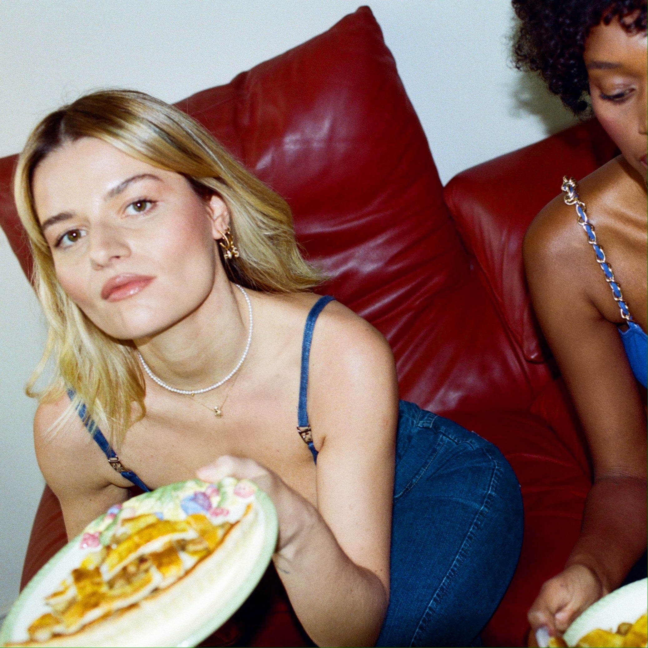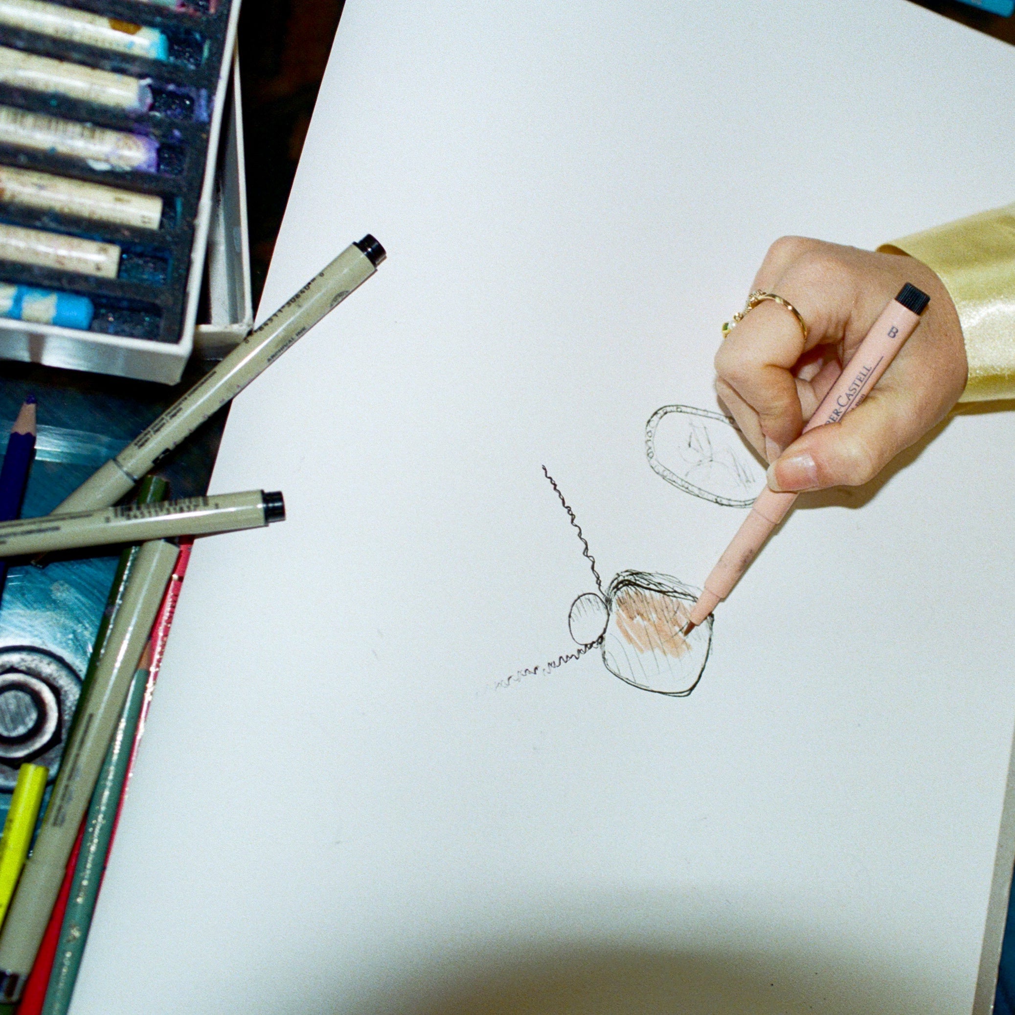 Soyons amis ! Découvrez notre collier Mimi de la collection Sabina Socol x Fedoma, orné d'un pendentif parfum en or massif 14 carats, dessiné à la main par Sabina, rappelant sa collection de flacons de parfum depuis son adolescence.