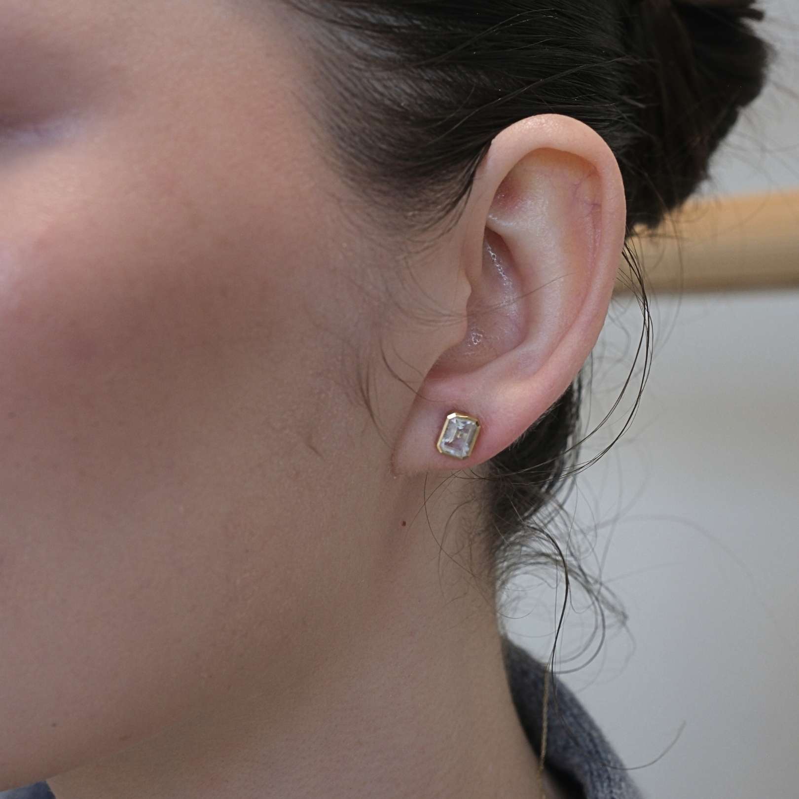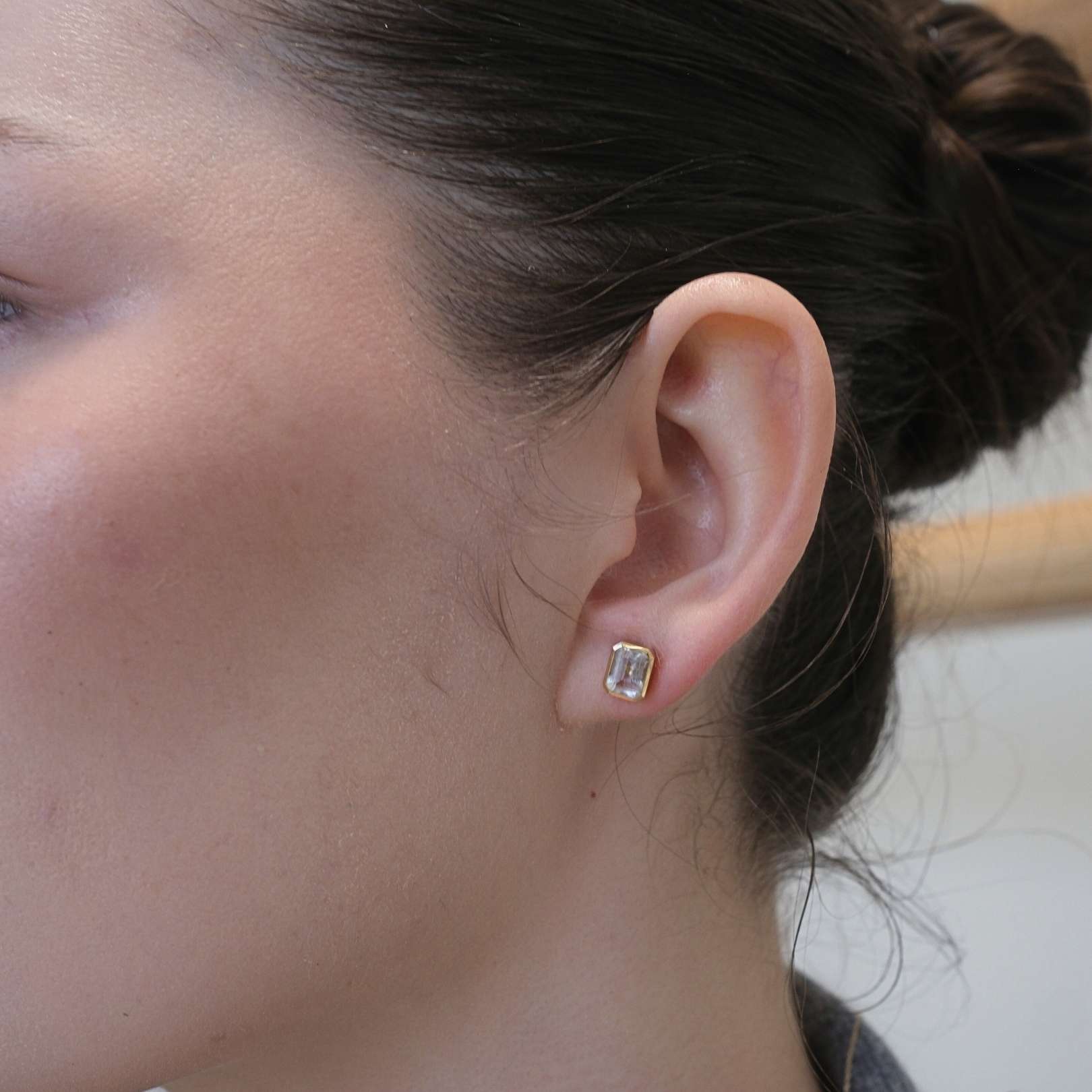 Radiant and timeless, these 18k gold emerald-cut stud earrings combine sleek geometry with refined elegance.
