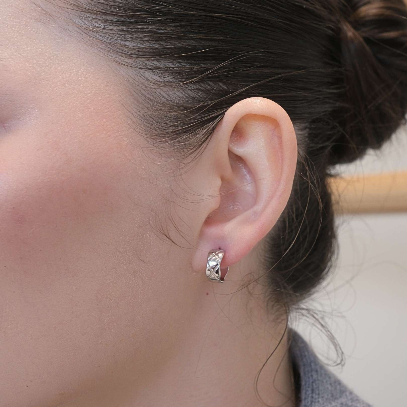 Their softly contoured silhouette hugs the ear gracefully, while the quilted-inspired pattern adds texture and quiet intrigue — making them the perfect balance of bold and understated.