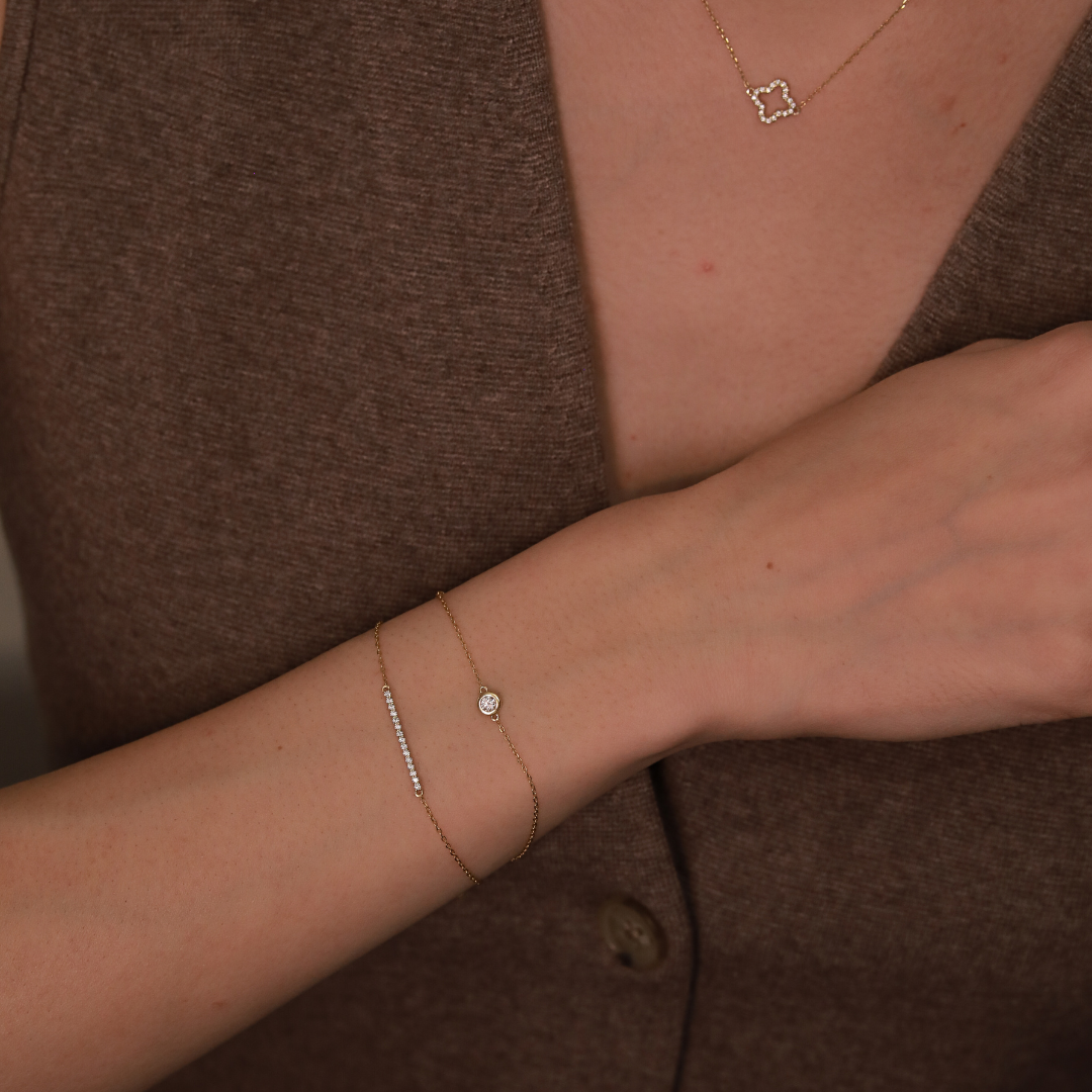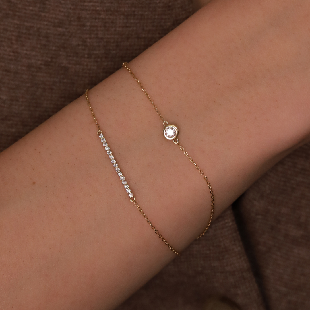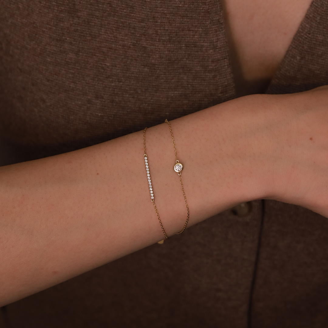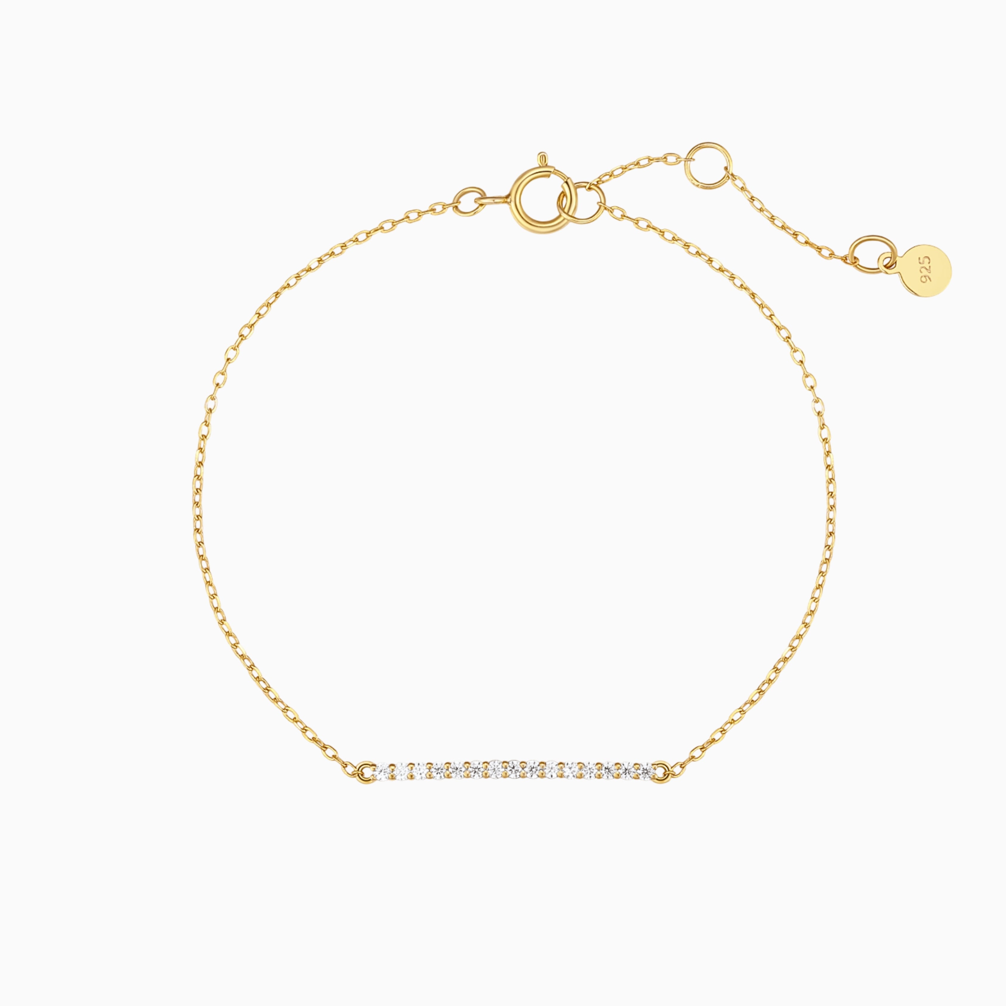 Refined and luminous, this bracelet is designed with a slender gold-toned chain that leads to a graceful row of brilliantly cut stones. Each stone is aligned in a clean, linear silhouette, capturing the light with a subtle shimmer that feels both modern and timeless.