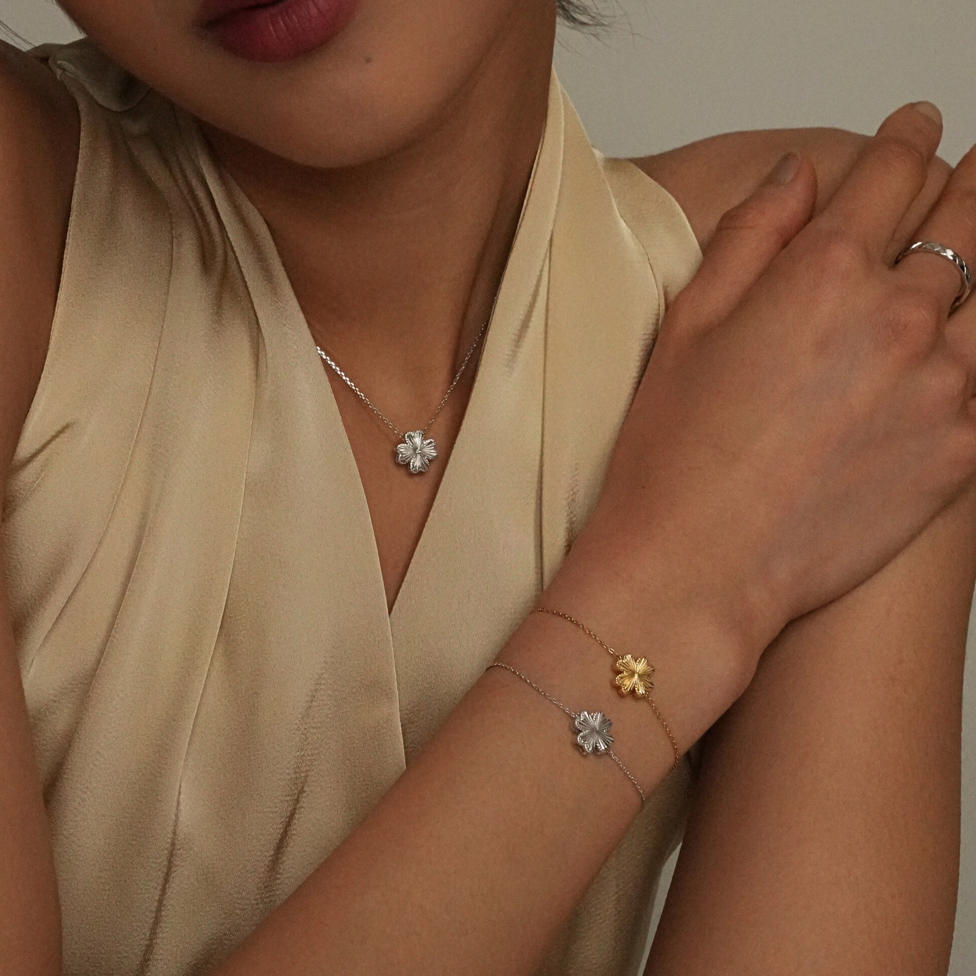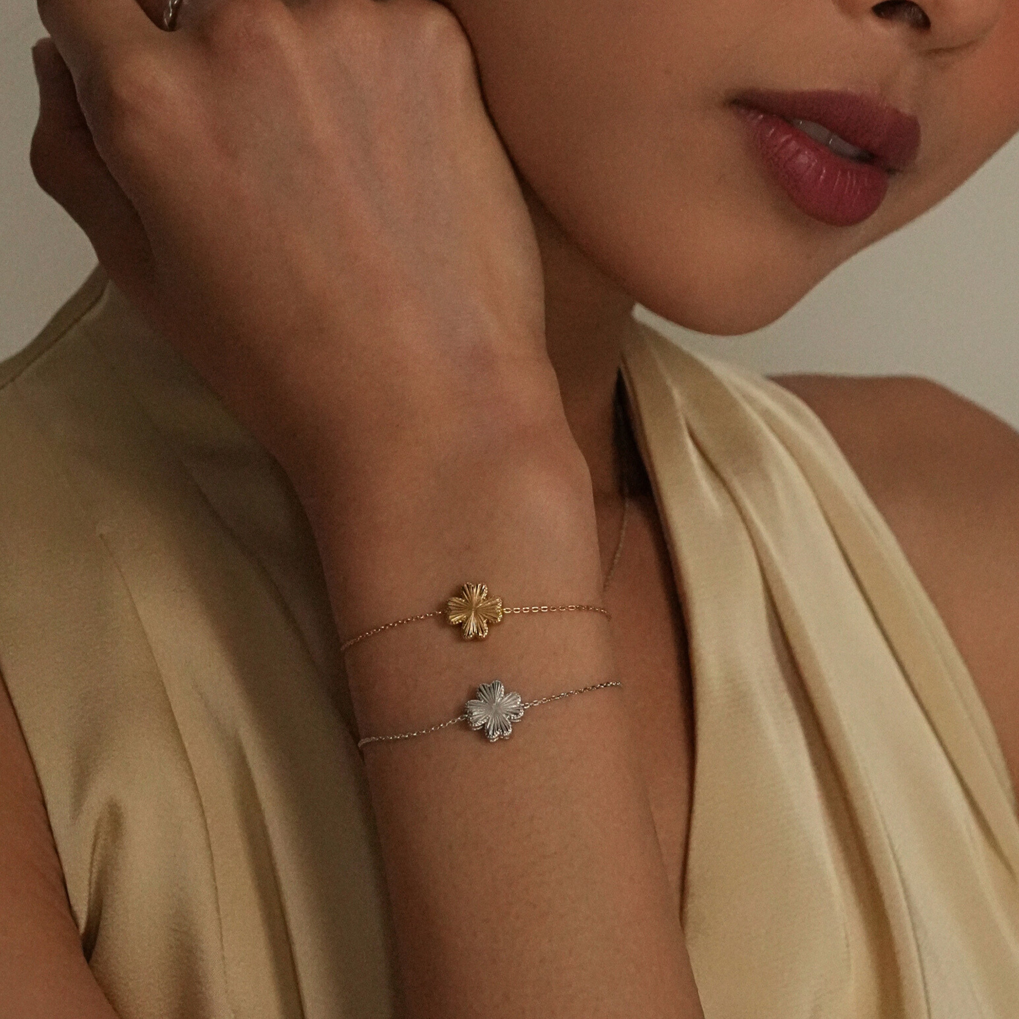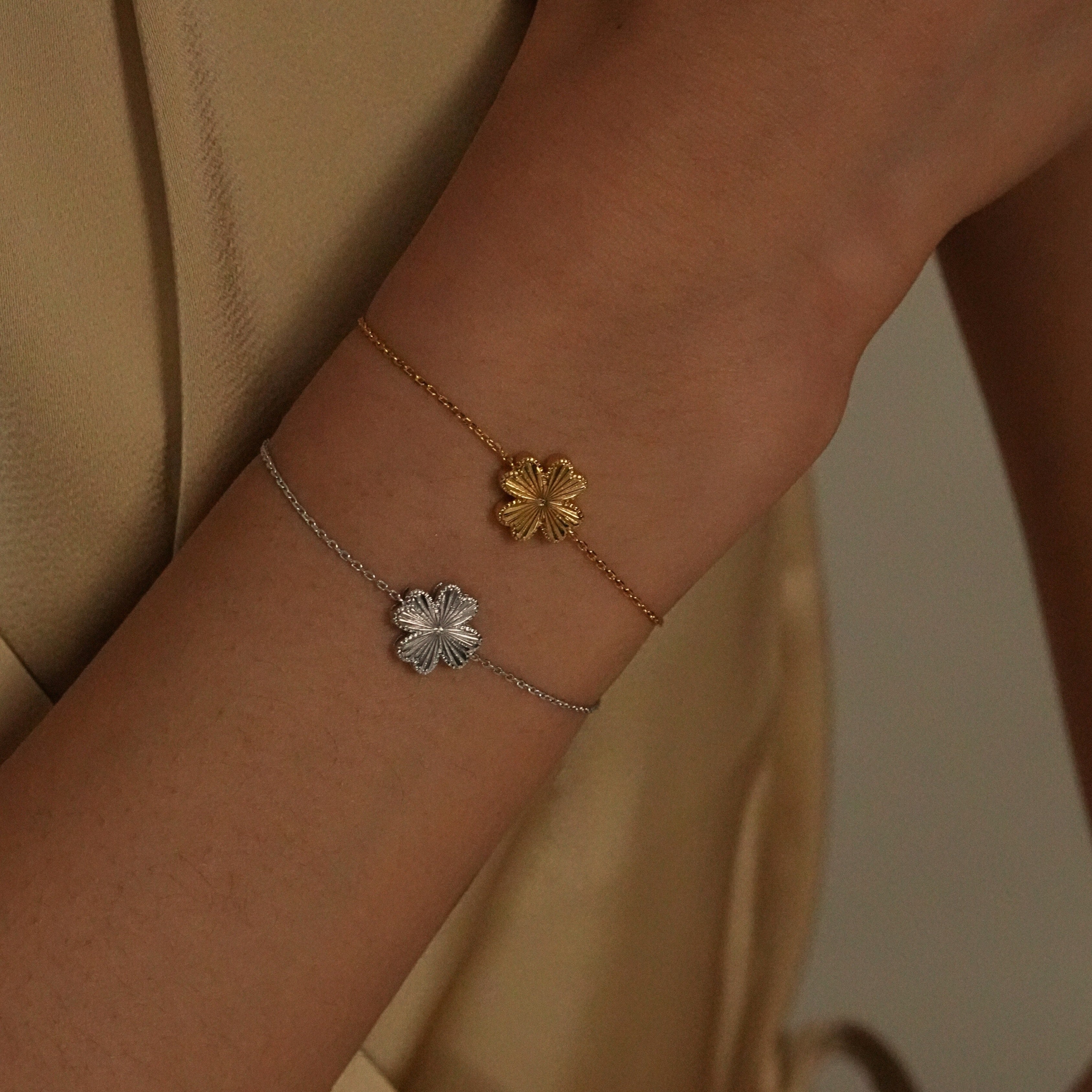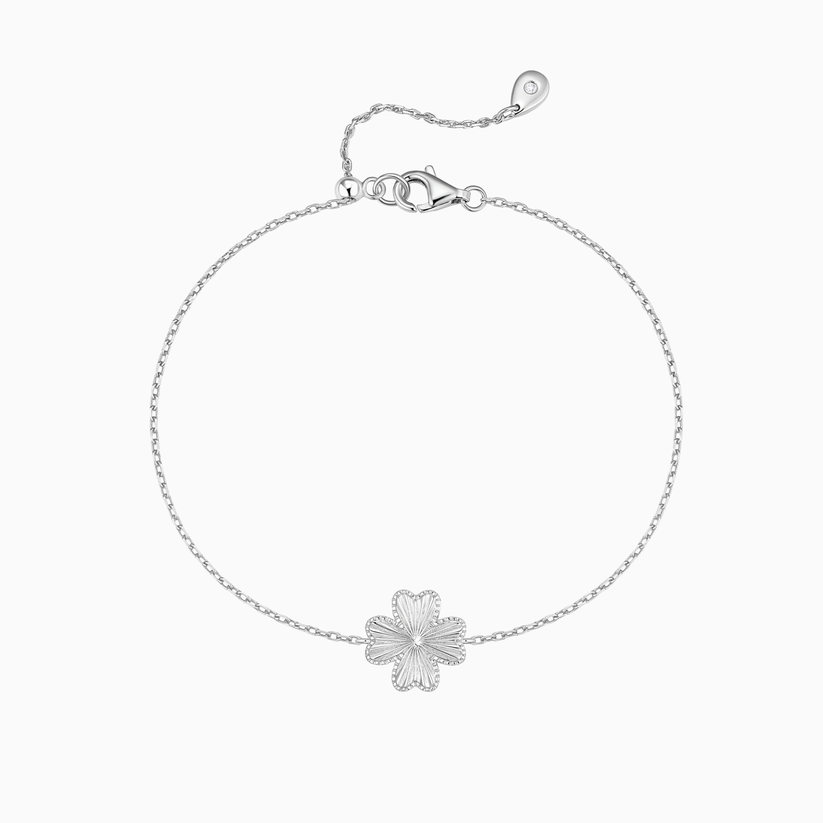 Refined and luminous, this bracelet features a delicate four-petal clover silhouette finished with a laser-cut surface that reflects light beautifully. The precise detailing creates a soft shimmer with every movement, offering an elegant yet modern look.
