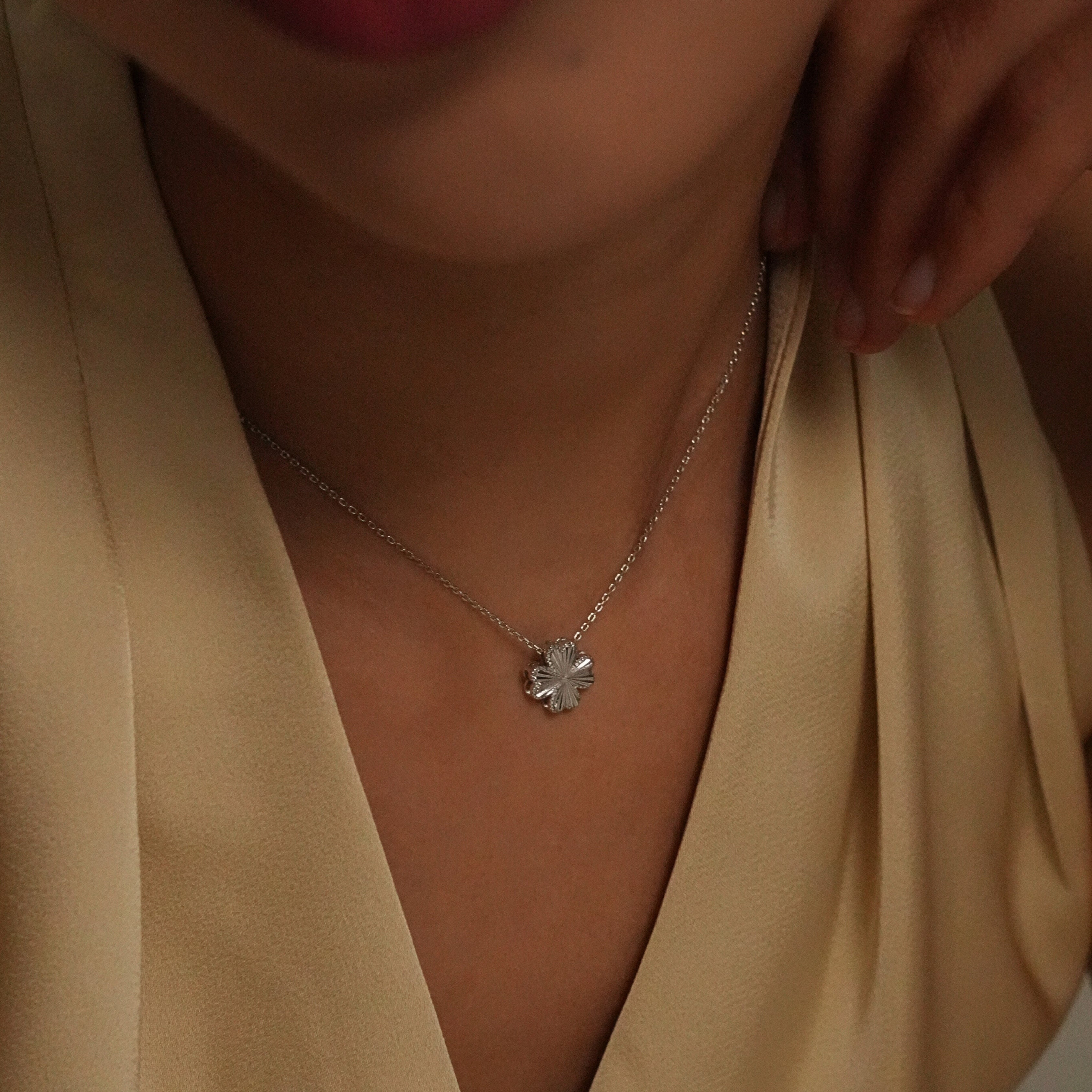 Graceful and modern, this necklace showcases a four-petal clover motif enhanced with a laser-finished surface that catches the light from every angle. The clean silhouette and subtle shimmer create a refined statement that feels light, elegant, and timeless.