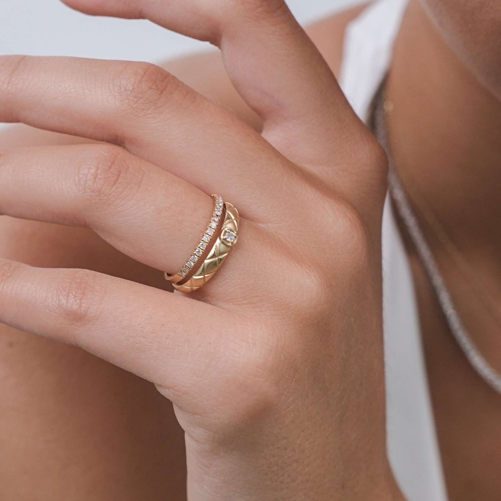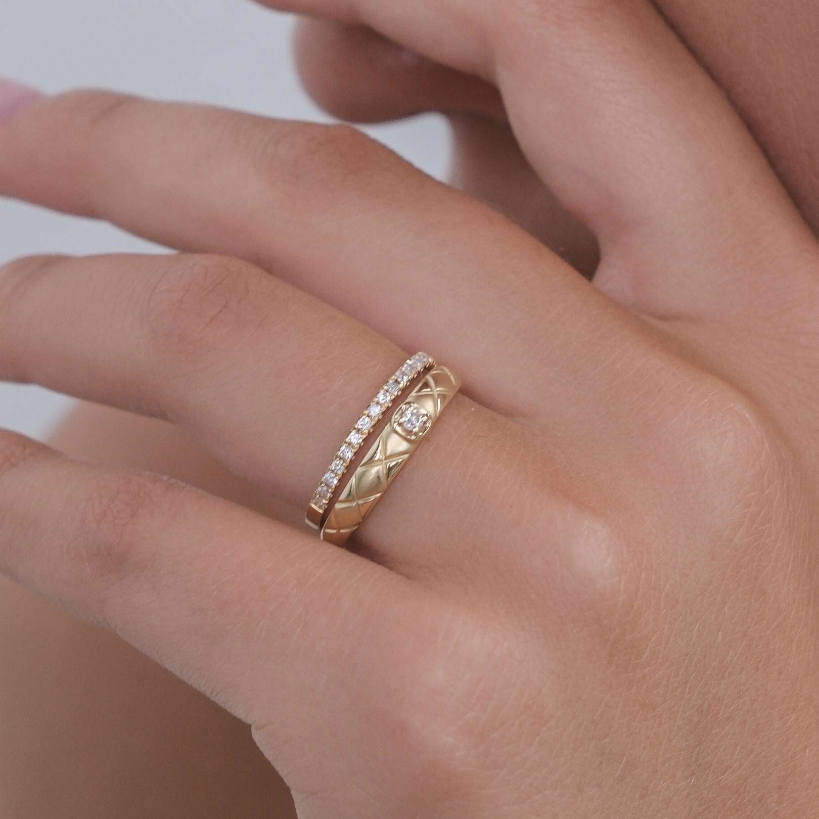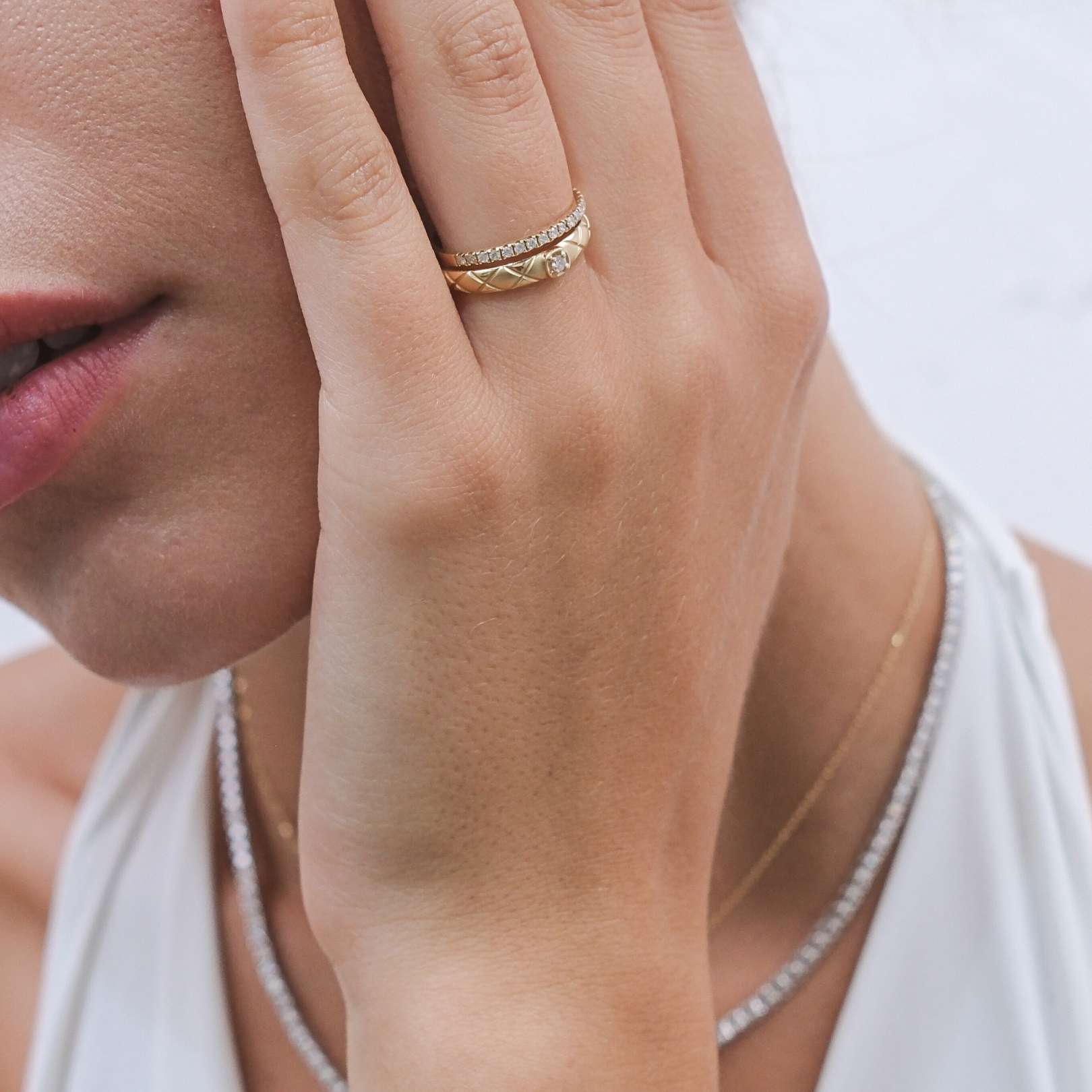 The band — slightly thicker for presence and comfort — is adorned with subtle, embossed diamond-patterned lines that wrap continuously around the ring, adding texture, light play, and a whisper of architectural elegance.