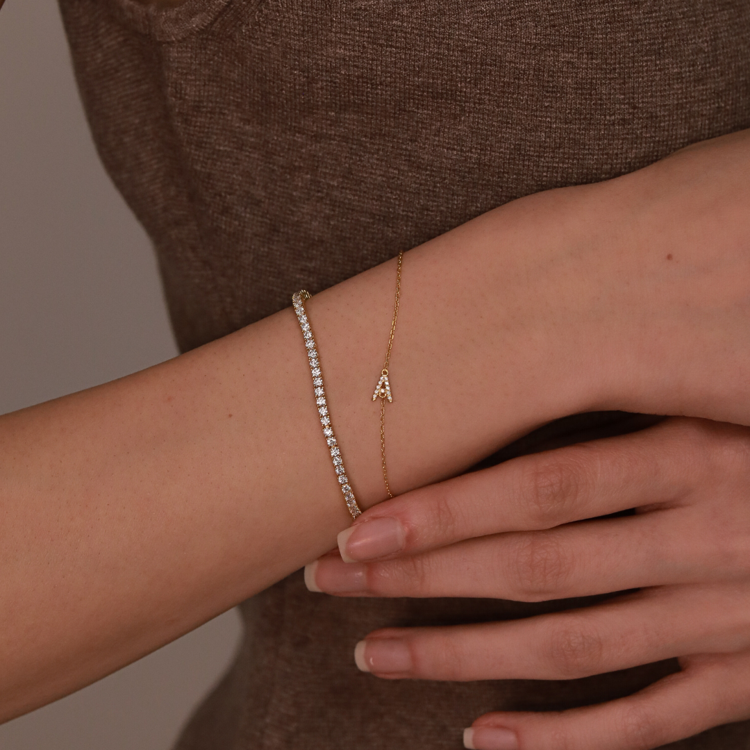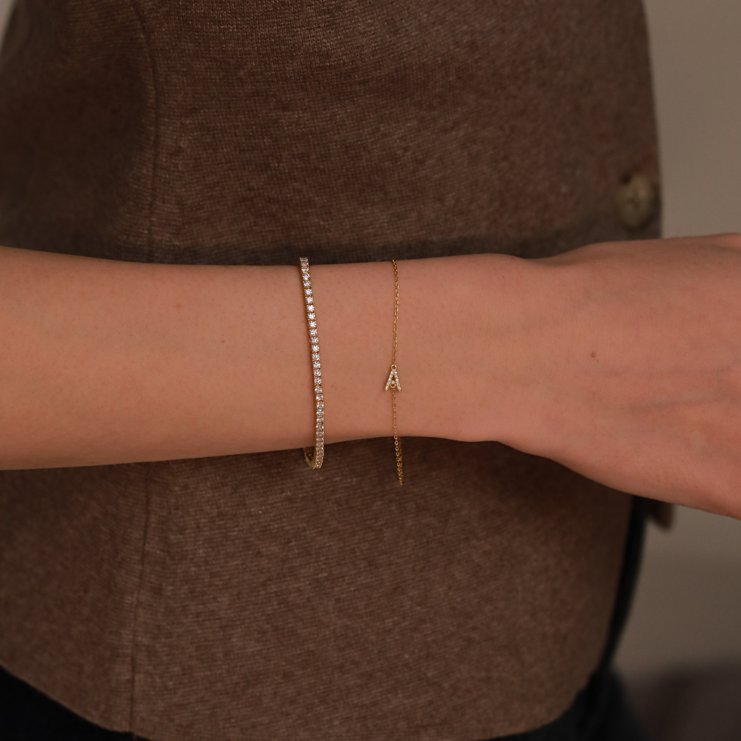 Crafted to complement any style, it offers a subtle yet meaningful way to carry an initial close. Whether worn solo for minimalist elegance or stacked for a more expressive look, this bracelet adds a timeless, customised touch to your everyday jewelry.