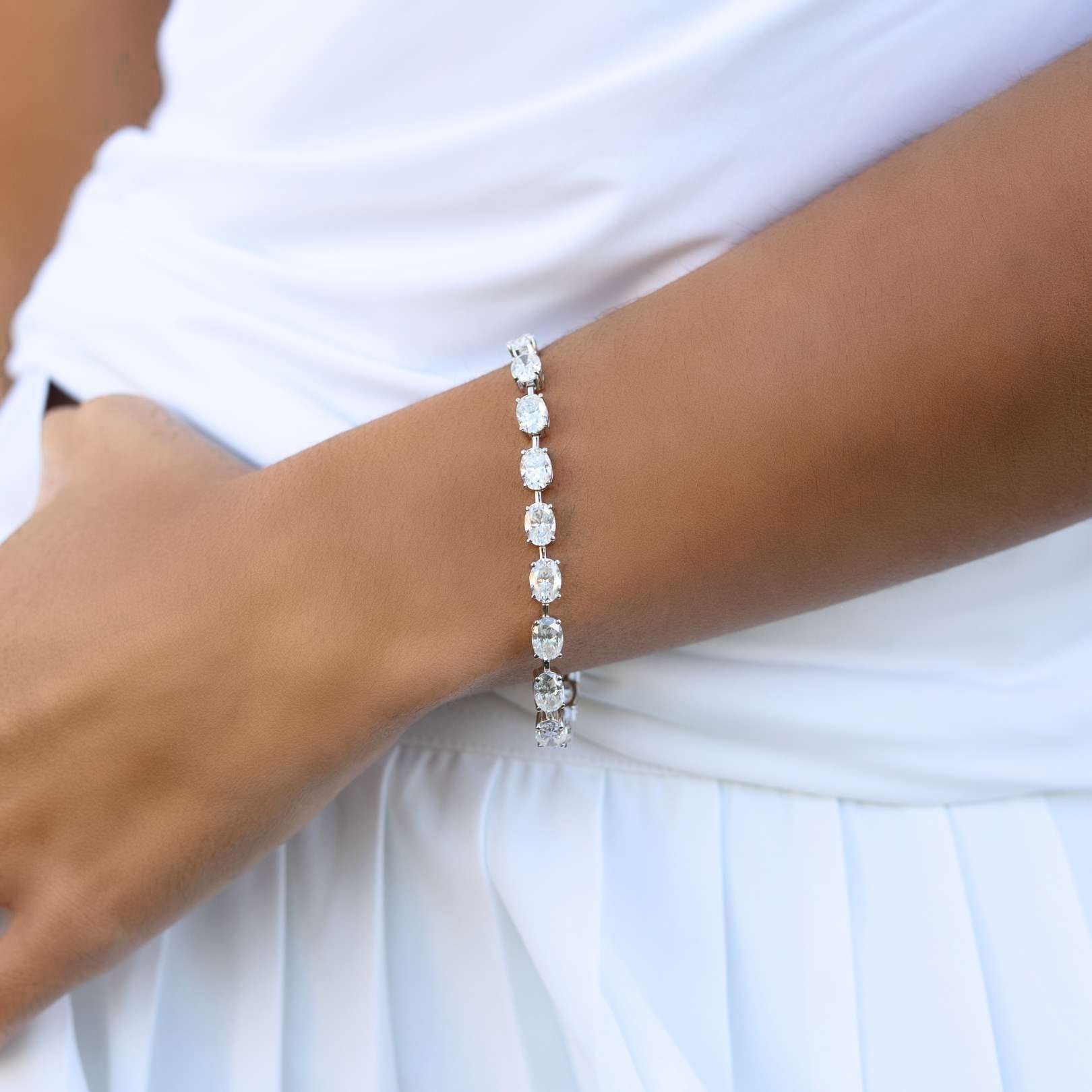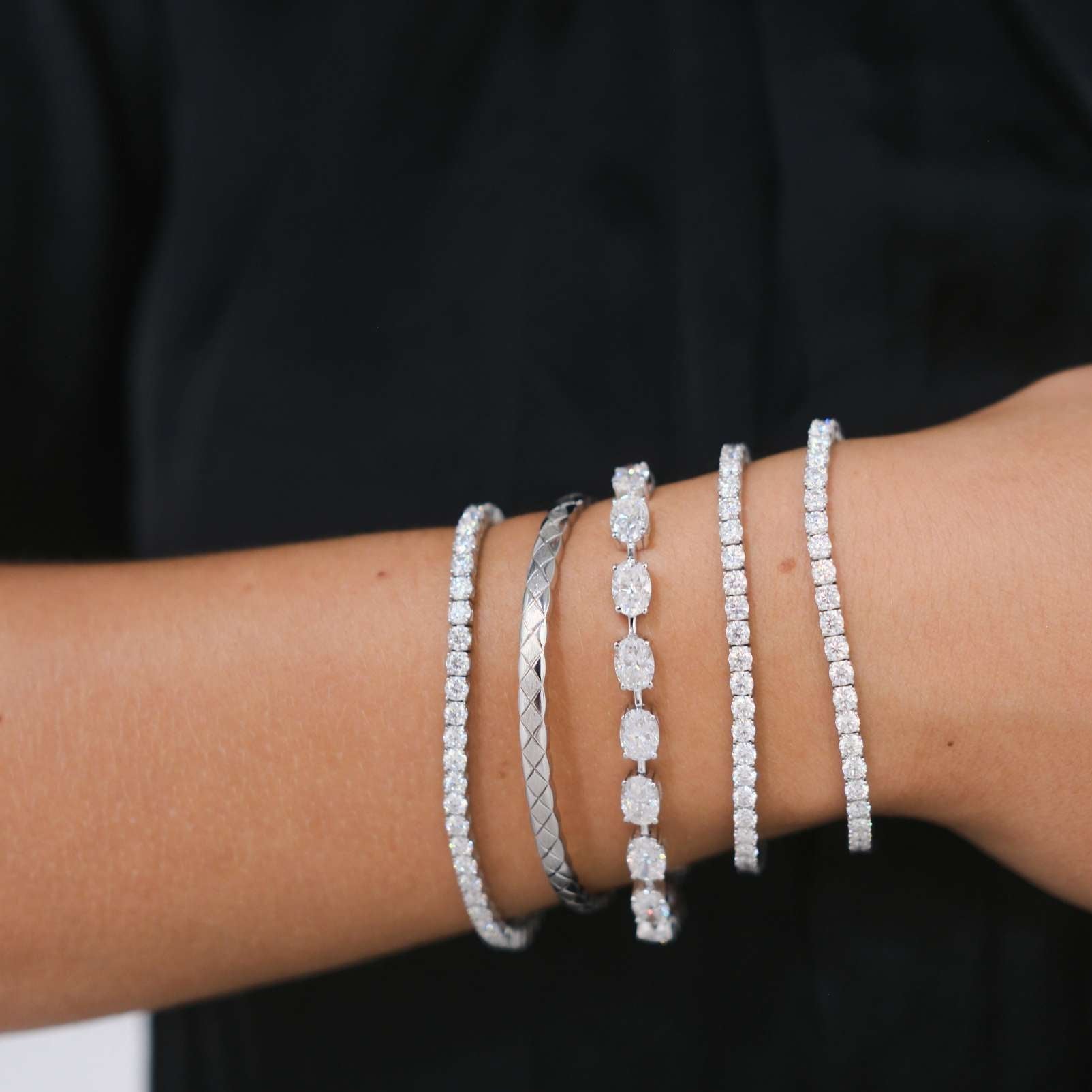 The streamlined silhouette offers a graceful wrist-hugging fit, with the clean geometry of the oblong moissanite stones adding a contemporary twist to its enduring appeal.