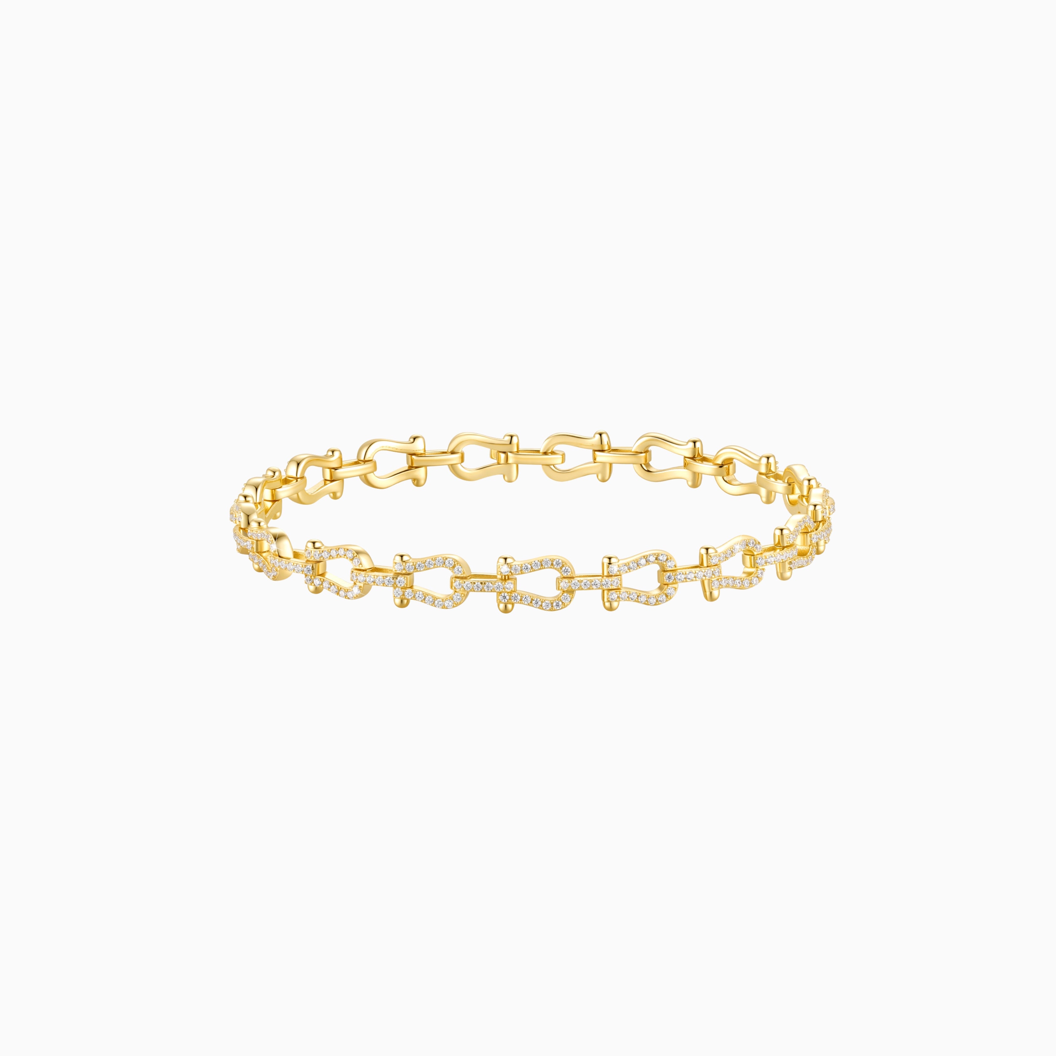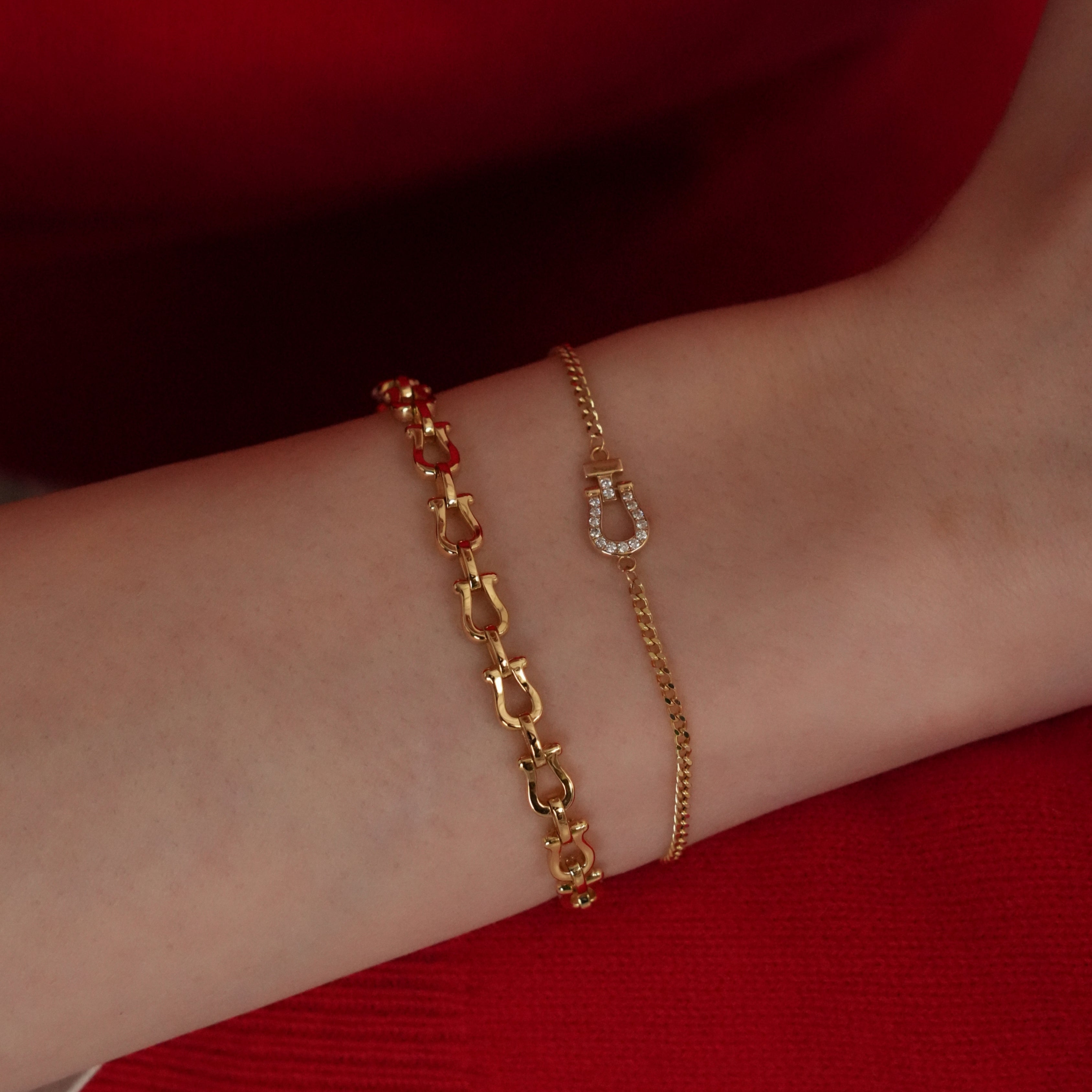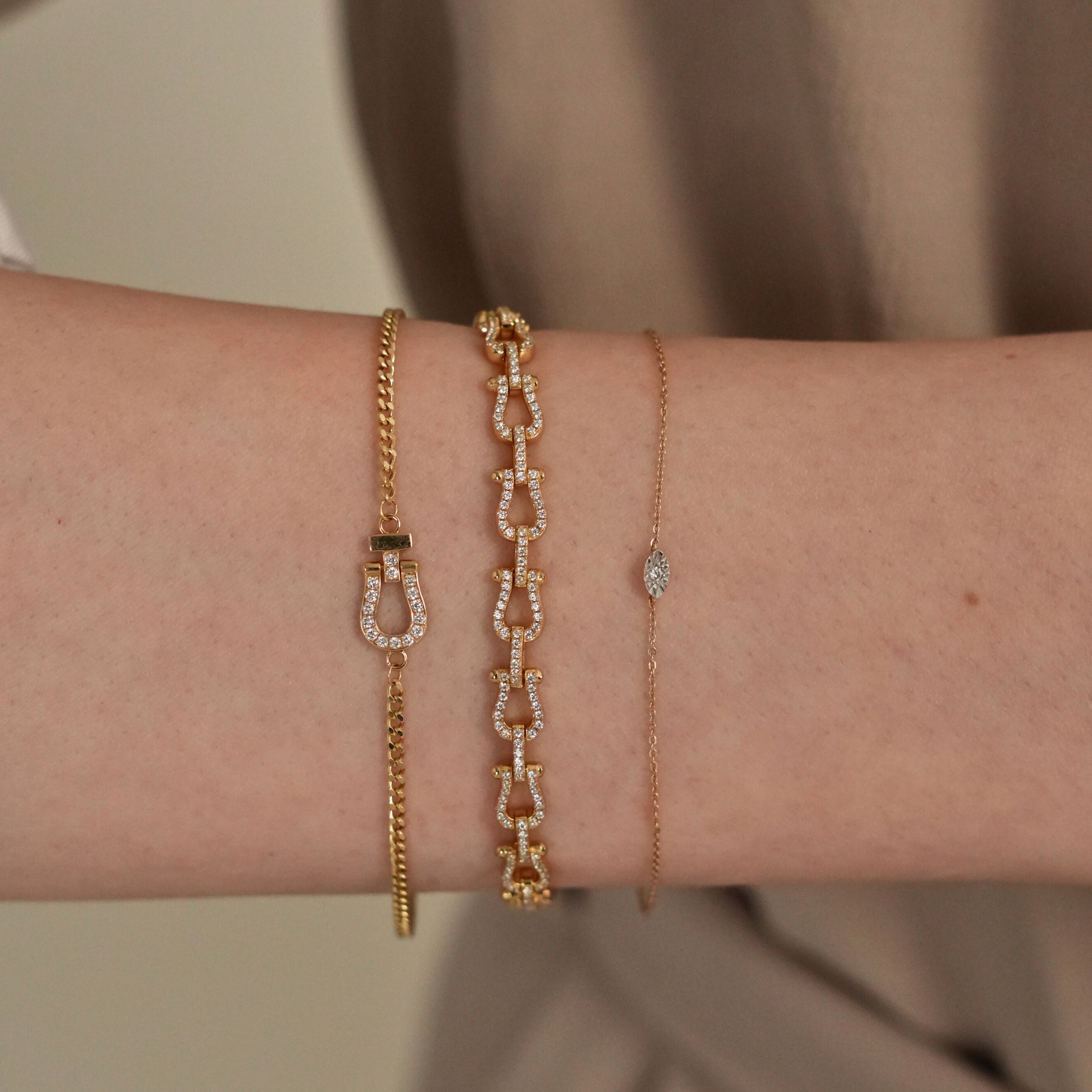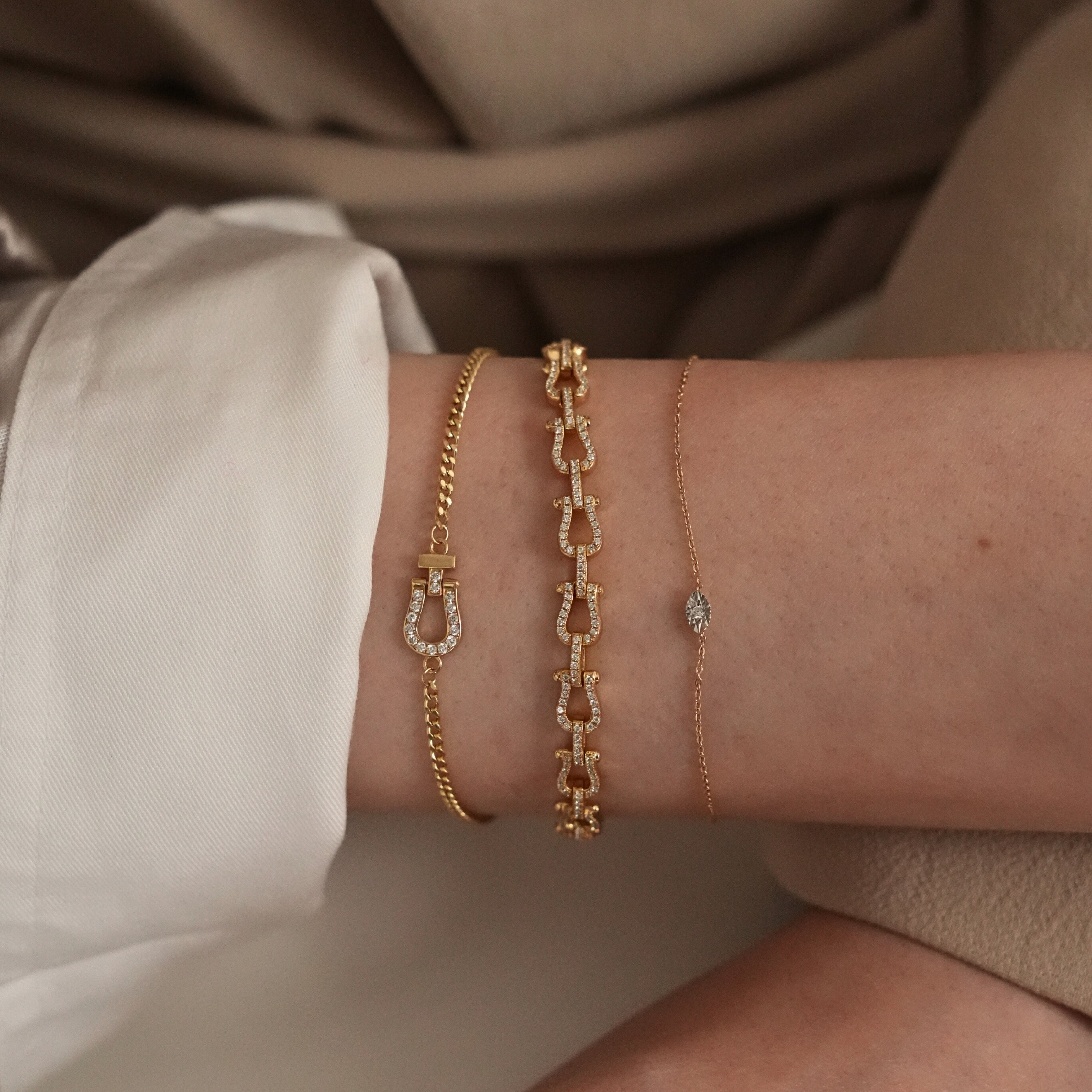 Refined and thoughtfully designed, this bracelet features a sleek horseshoe-inspired motif accented with subtle sparkle on one side. The reverse reveals a clean, stone-free surface, allowing the piece to be worn two ways depending on your mood or styling needs.