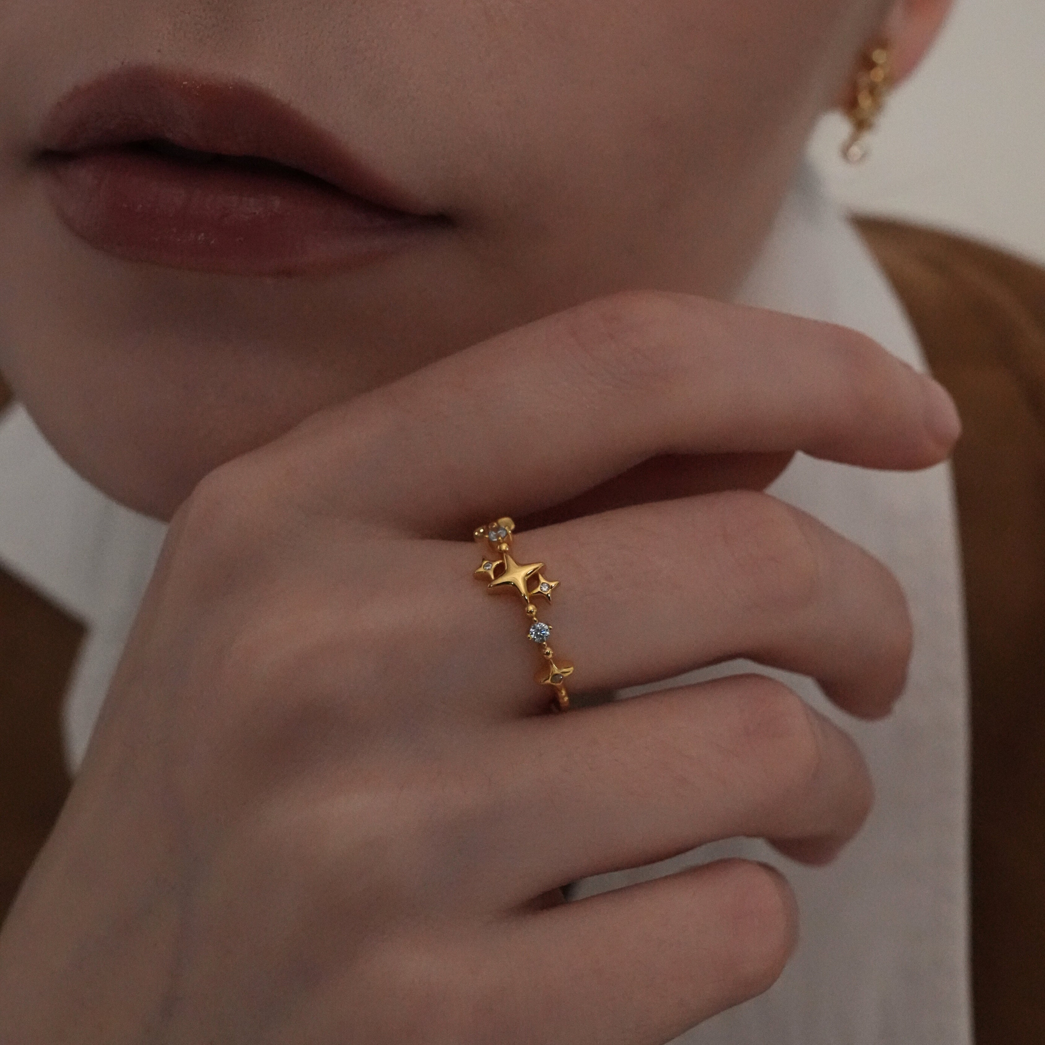 Inspired by a scattered night sky, this ring features tiny star-shaped motifs and delicate stones arranged in a whimsical, constellation-like pattern. Its airy design adds a hint of sparkle without overpowering the hand.